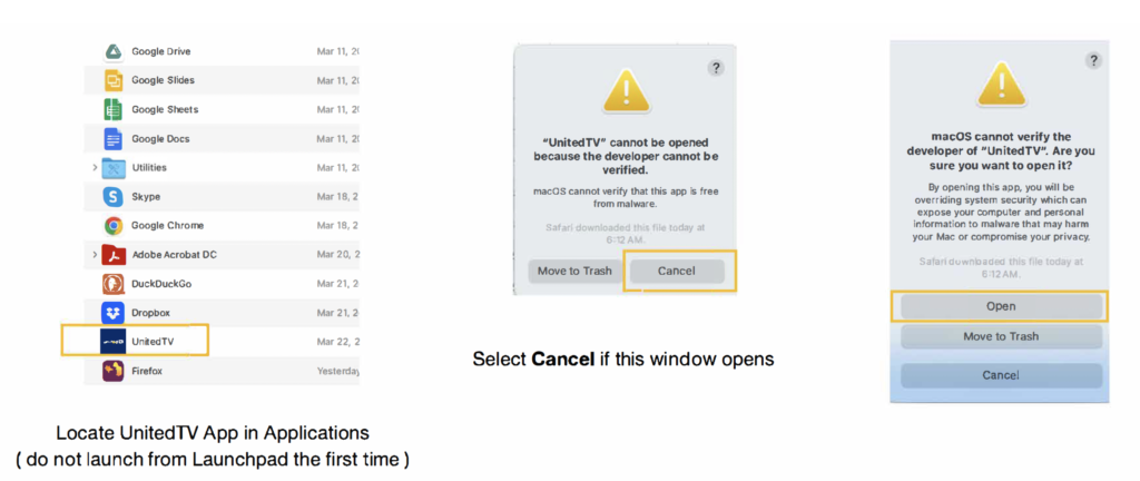2. In the finder on your Mac, locate the UnitedTV App. Do not use Launchpad when opening for the first time.